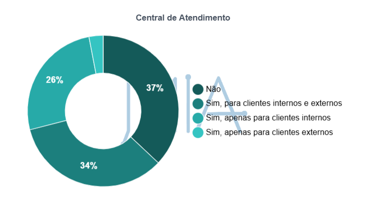 Em se tratando de centrais de atendimento ao cliente, sua estruturação ainda é heterogênea entre os CSCs. 37% afirmam não possuir central, enquanto 34% operam com atendimento para clientes internos e externos e 26% mantêm a central voltada apenas para clientes internos. A distribuição sugere que, para parte relevante das organizações, o atendimento ainda é tratado de forma menos centralizada, ao passo que outro grupo já busca consolidar a experiência do usuário por meio de uma estrutura dedicada.