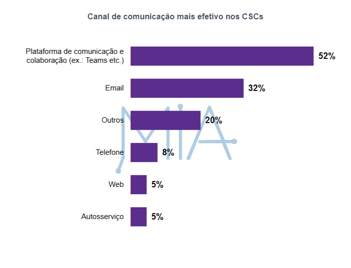 Além da estrutura de atendimento, os canais de comunicação também desempenham um papel importante na experiência do cliente. Quando o tema é comunicação, os dados indicam uma preferência clara por plataformas de colaboração (ex.: Teams), apontadas como o canal mais efetivo por 52% dos respondentes. O e-mail aparece em seguida, com 32%, reforçando que ainda é um canal relevante para formalizações e registros. Já alternativas como telefone (8%), web (5%) e autosserviço (5%) aparecem com menor incidência, o que sugere que a efetividade percebida está mais associada a canais que combinam agilidade, contexto e interação direta.