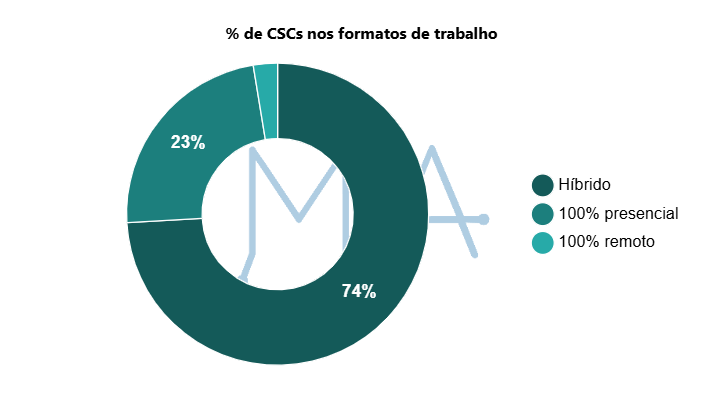 Os dados indicam que 74% dos CSCs operam em modelo híbrido, enquanto 23% seguem em formato totalmente presencial. Apenas uma parcela menor mantém equipes totalmente remotas.