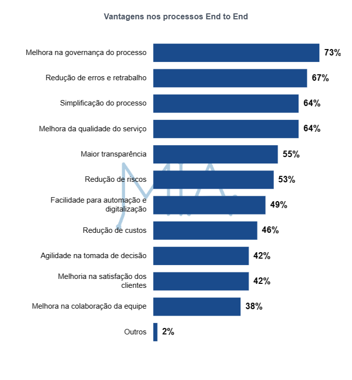 Conforme pode-se observar no gráfico acima, as organizações identificam diferentes benefícios na adoção de processos end-to-end que reforçam a relevância do tema, porque mostra que o modelo end-to-end é percebido principalmente como alavanca de melhora na governança do processo (73%), redução de erros e retrabalho (67%) e simplificação do processo e melhoria da qualidade do serviço (64%). Ou seja, não é um tema abstrato: ele traduz-se em ganhos concretos.
