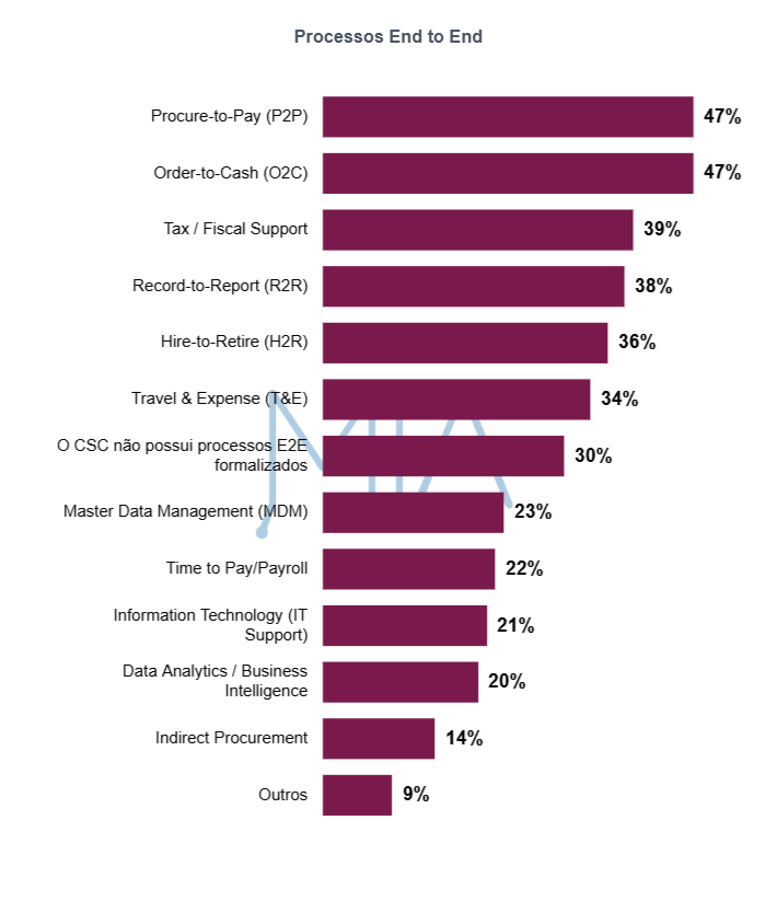 Além da estruturação, o nível de adoção dos processos end-to-end também varia entre as organizações. Os dados mostram que a adoção do modelo end-to-end nos CSCs ainda se concentra, principalmente, em processos mais consolidados e transacionais, como Procure-to-Pay (47%) e Order-to-Cash (47%), seguidos por Tax/Fiscal Support (39%) e Record-to-Report (38%). Esse cenário sugere que a formalização da gestão end-to-end costuma avançar primeiro em fluxos com maior impacto operacional, volume e necessidade de integração, enquanto outras frentes ainda aparecem com menor consolidação.