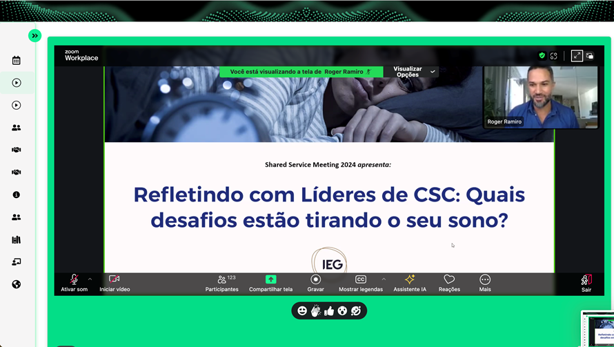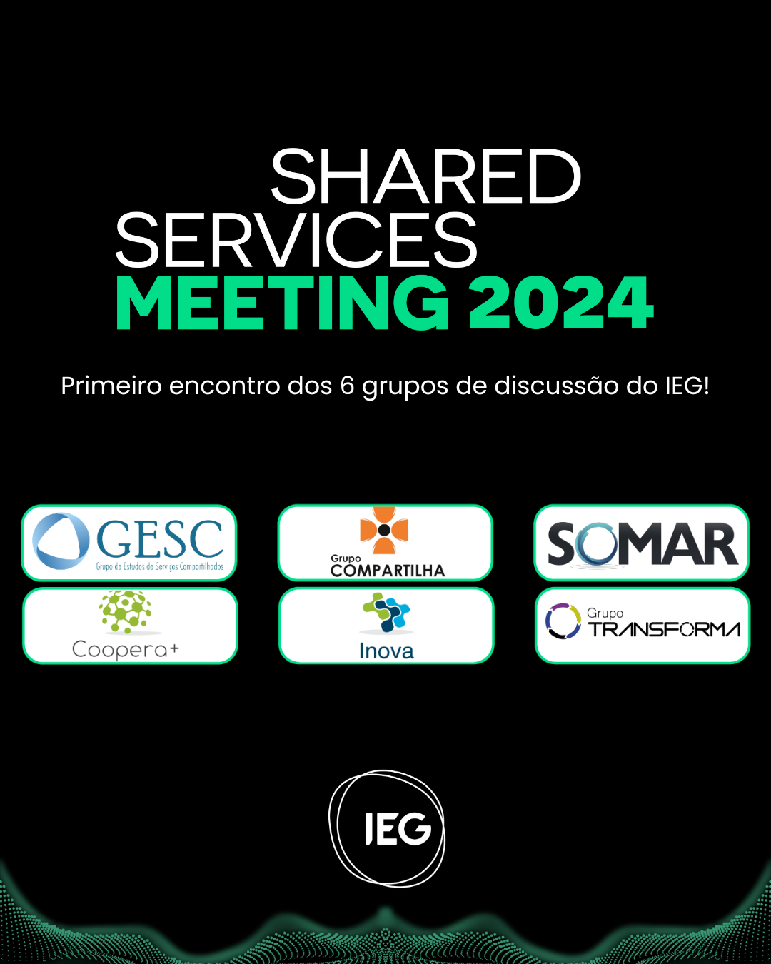 Em 2020, o IEG realizou o seu primeiro evento online e ao vivo para líderes e gestores de CSCs do país: o Shared Services Meeting. O SSM contou com um espaço interativo e virtual para consumo de conteúdos e relacionamento com a comunidade de Serviços Compartilhados. Participaram palestrantes renomados, executivos do segmento e grandes discussões sobre os principais desafios dos CSCs no Cenário Covid-19, em um espaço totalmente interativo e virtual para consumo de conteúdo de qualidade. Em 2021, 2022 e 2023 mais uma vez realizamos edições importantes desse grande evento.